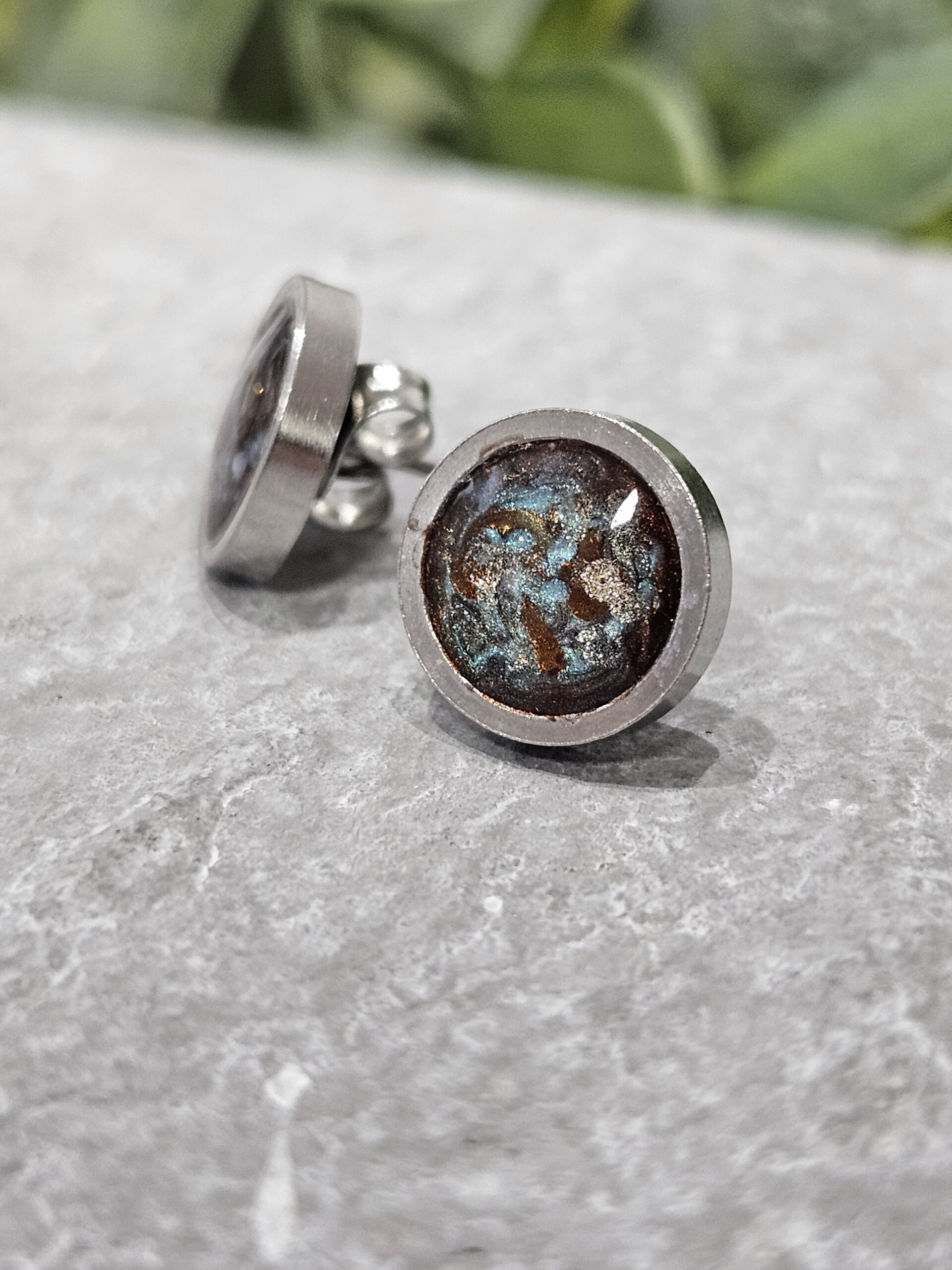 Boucles d’oreilles sur tiges, en acier inoxydable hypoalergénique, peintes à la main avec vernis et résine epoxy.