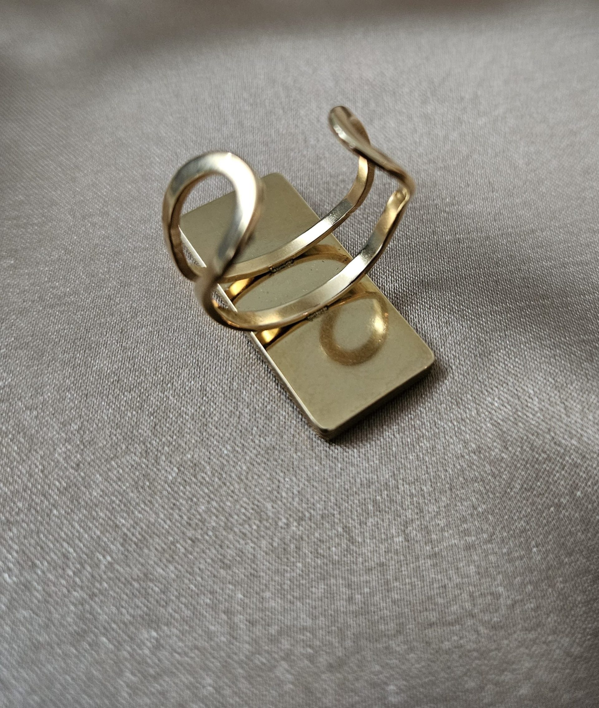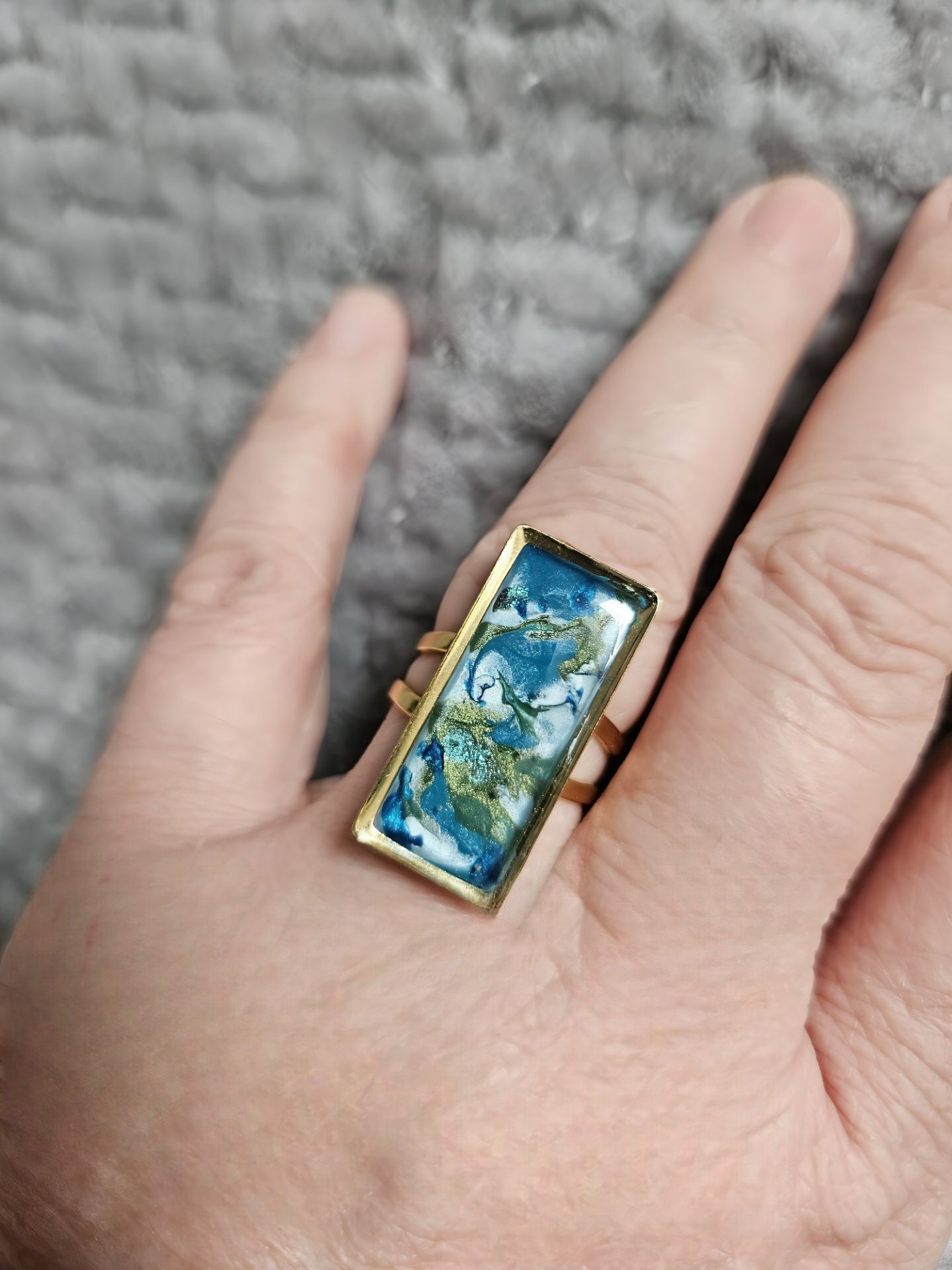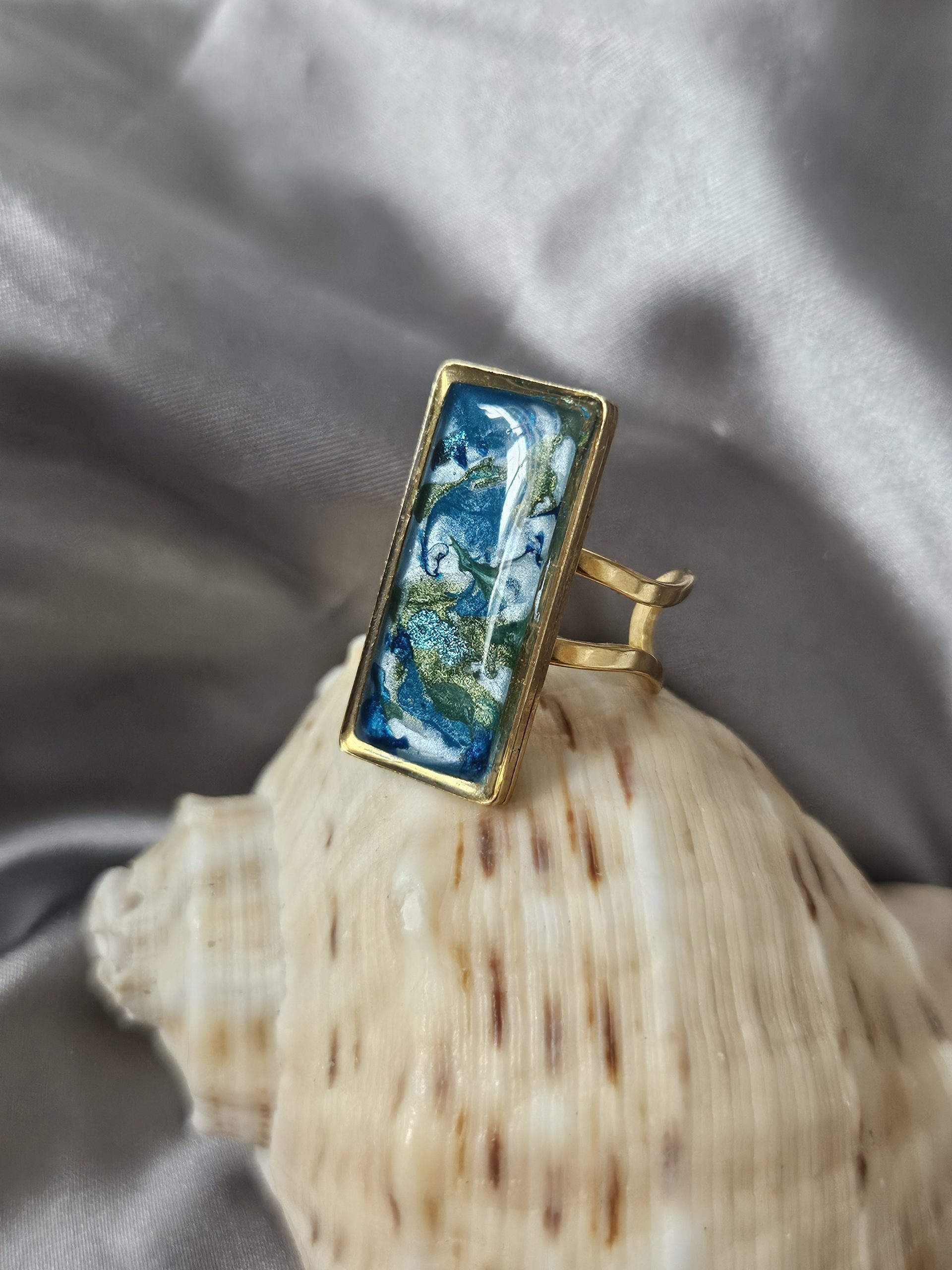 Bague en acier inoxydable plaquée or hypoallergénique, peinte à la main avec vernis à ongles et résine époxy, légèrement ajustable. 1cm x 2.5 cm.