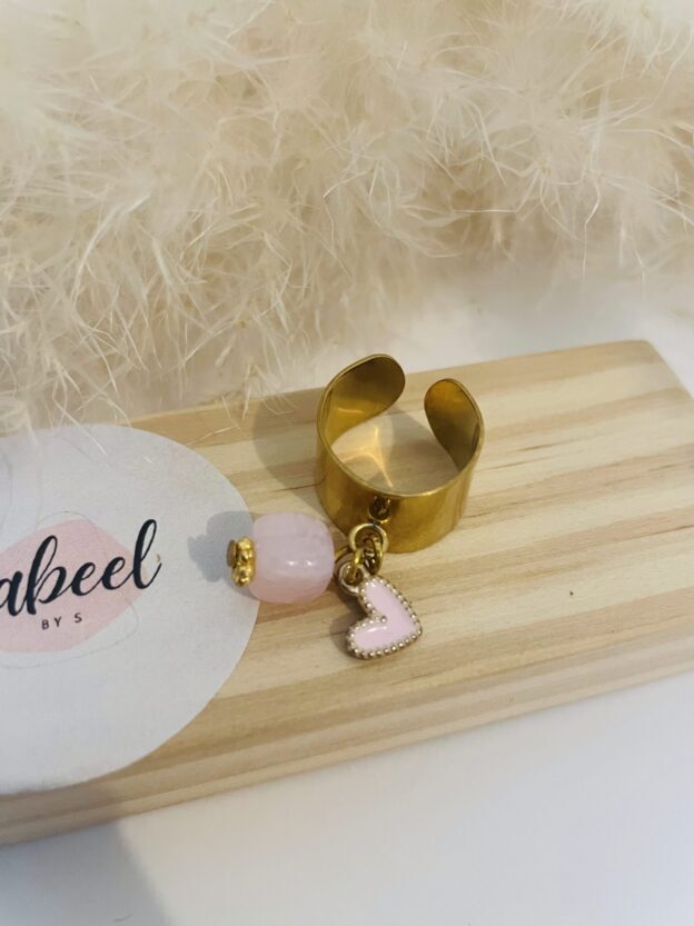 Bague en acier inoxydable ajustable avec 2 charms ; pierre naturelle rose et coeur en alliage