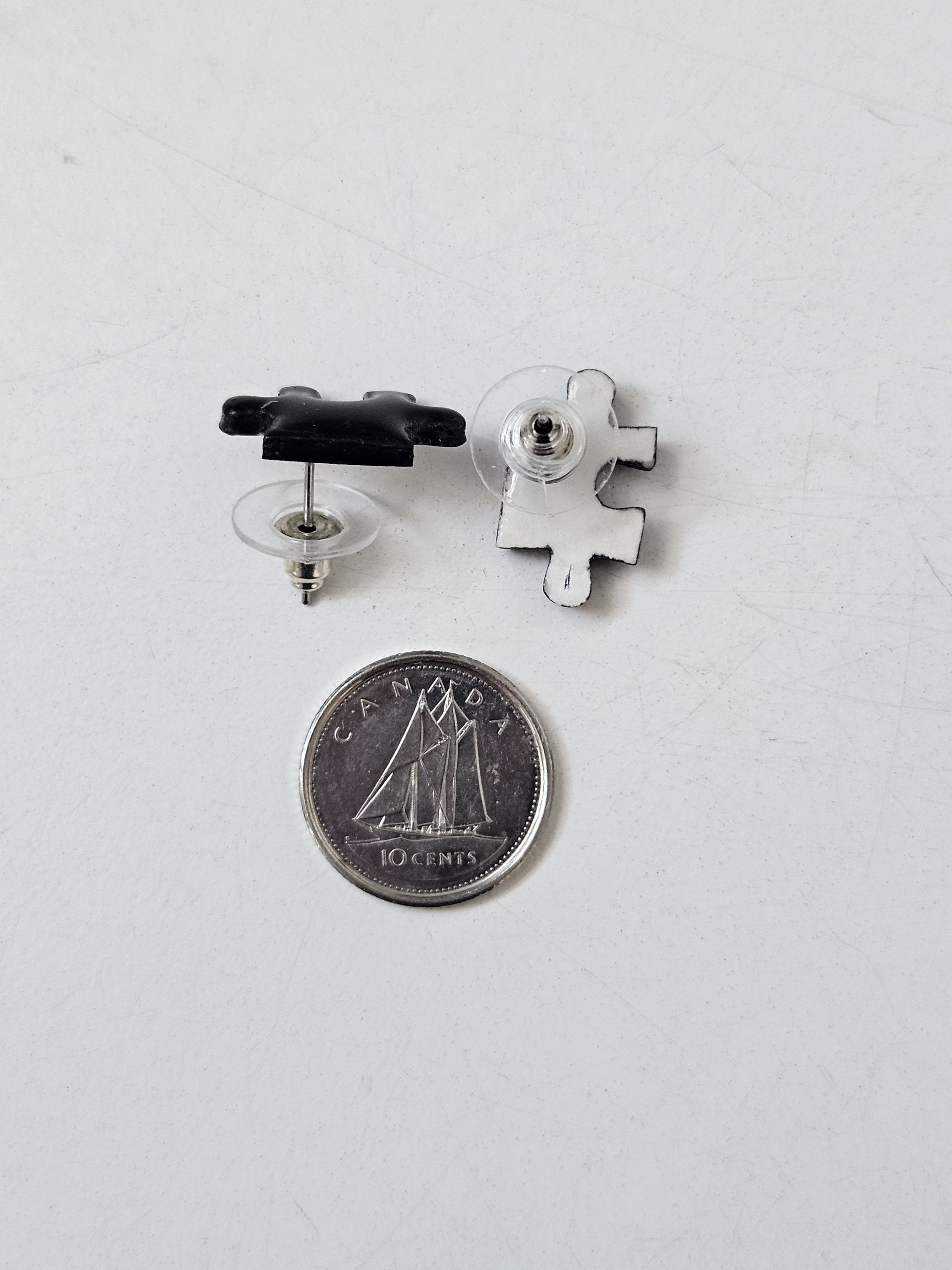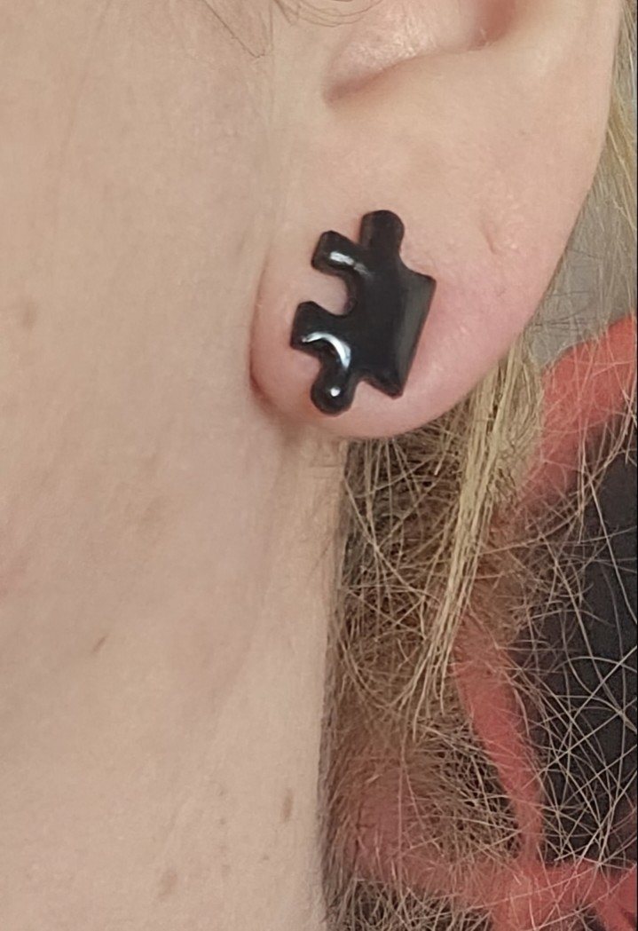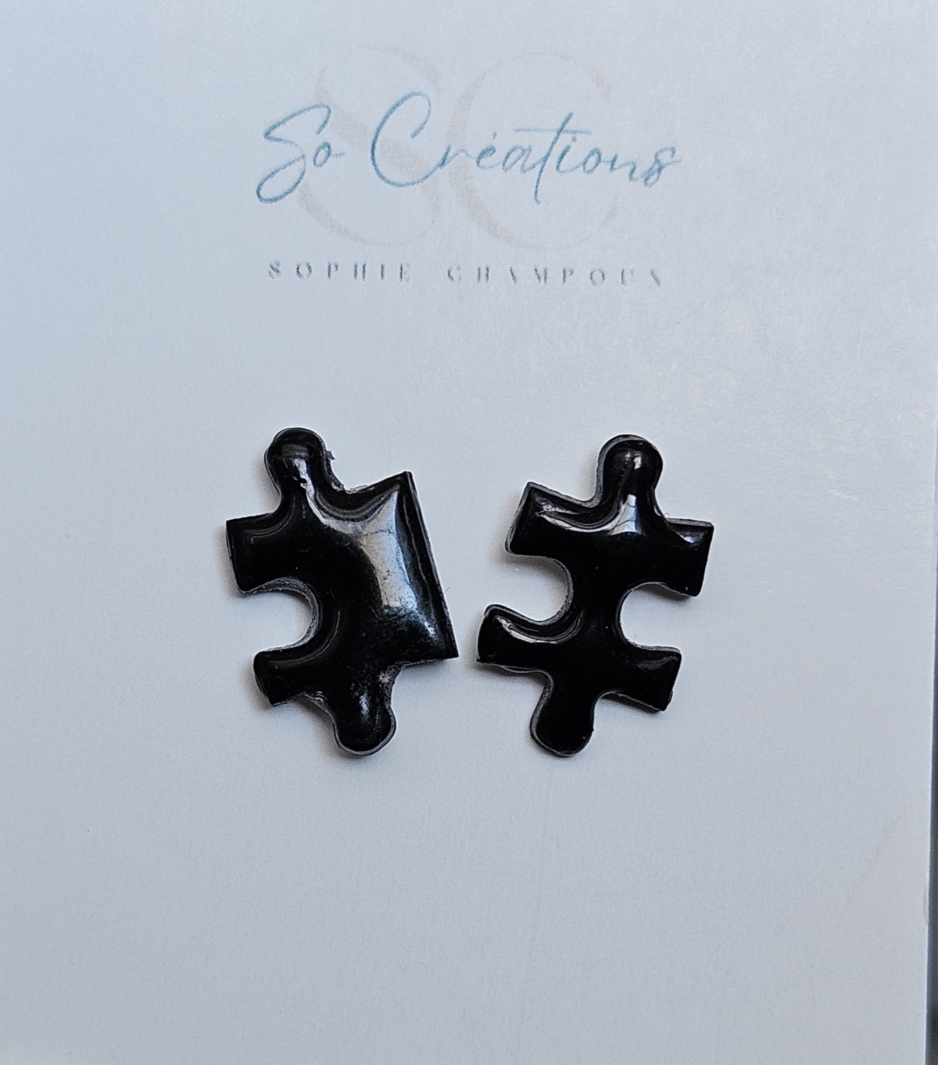 Boucles d’oreilles sur tiges en forme de casse-tête, peintes à la main avec vernis à ongles et recouvertes de résine époxy. Tiges en acier inoxydable hypoallergénique.