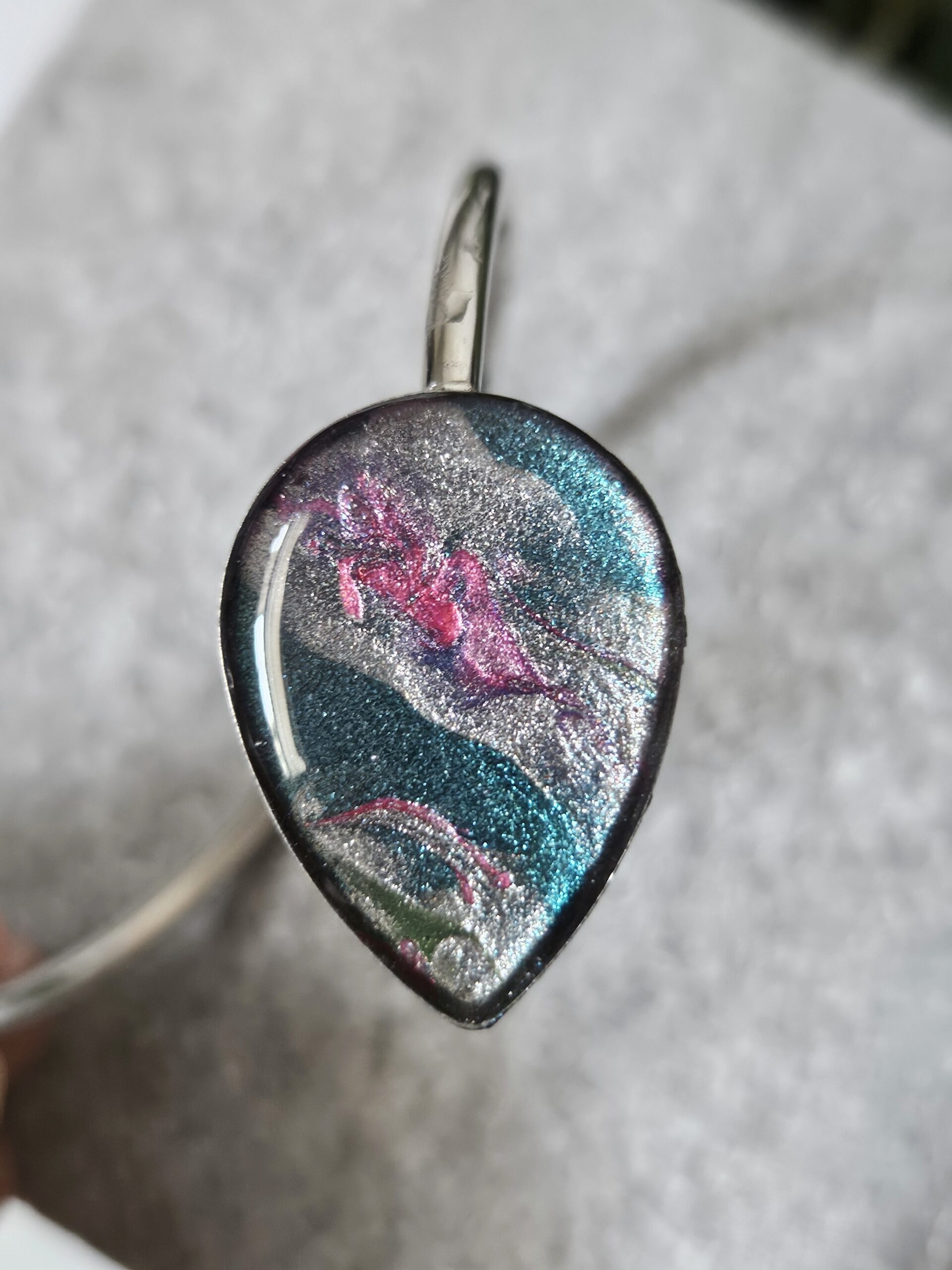 Bracelet en acier inoxydable hypoallergénique, peint à la main avec vernis à ongles et résine époxy. Malléable pour agrandir ou rapetisser légèrement, et se contorsionne pour mettre au poignet, et reste stable dans l’ajustement final.