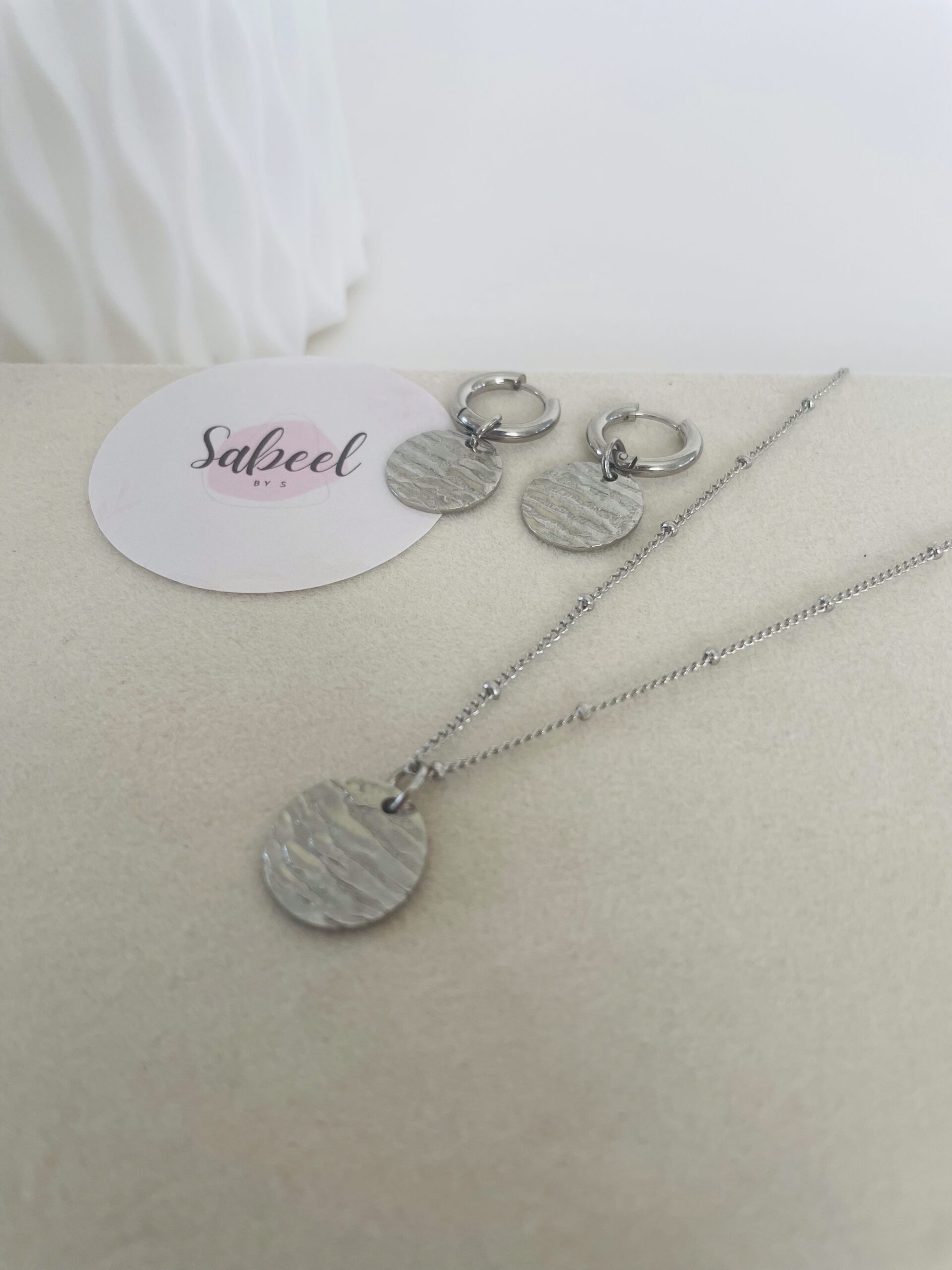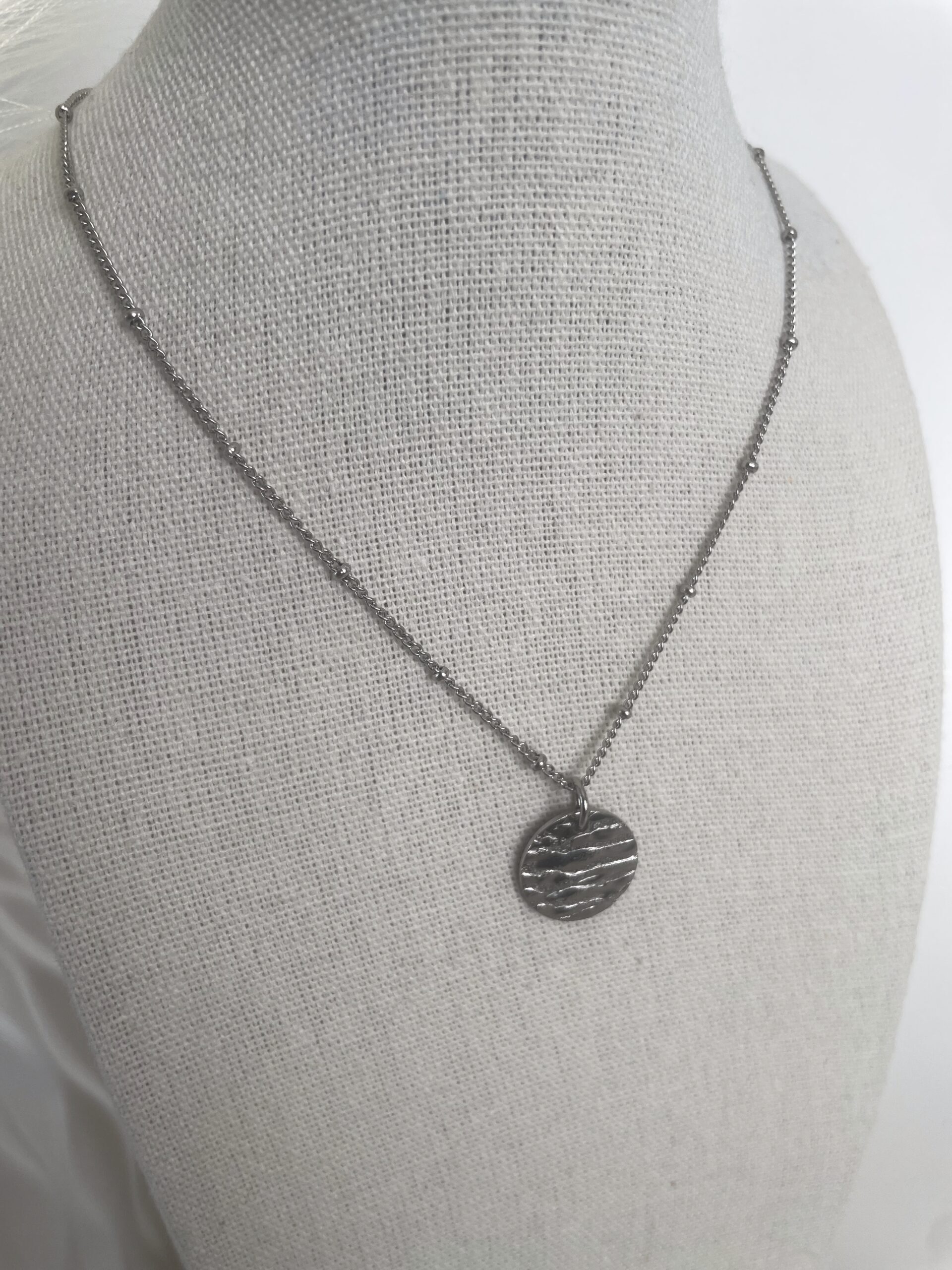 Collier en acier inoxydable perlé avec charm grand rond martelé en acier inoxydable