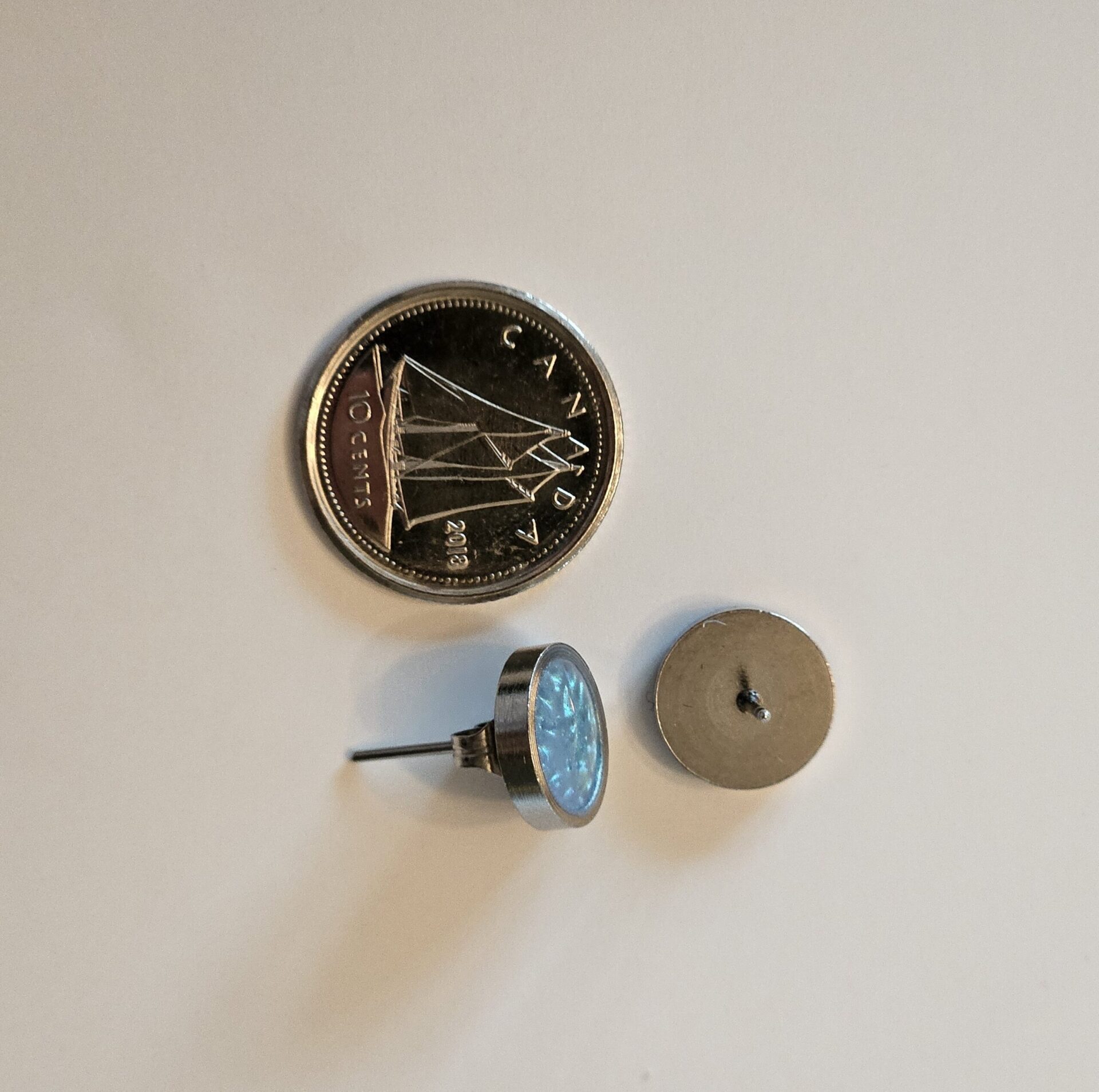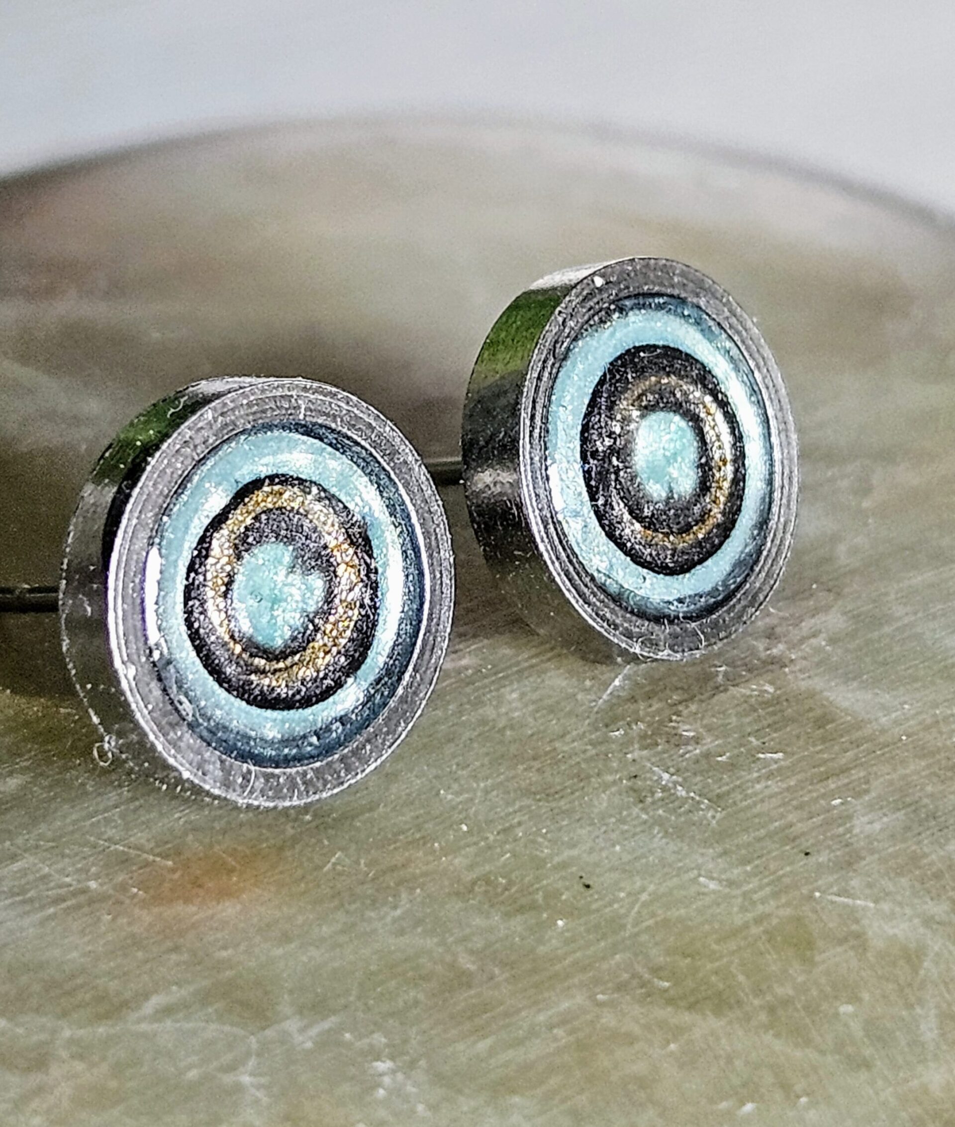Boucles d’oreilles sur tiges, en acier inoxydable hypoalergénique, peintes à la main avec vernis et résine epoxy.