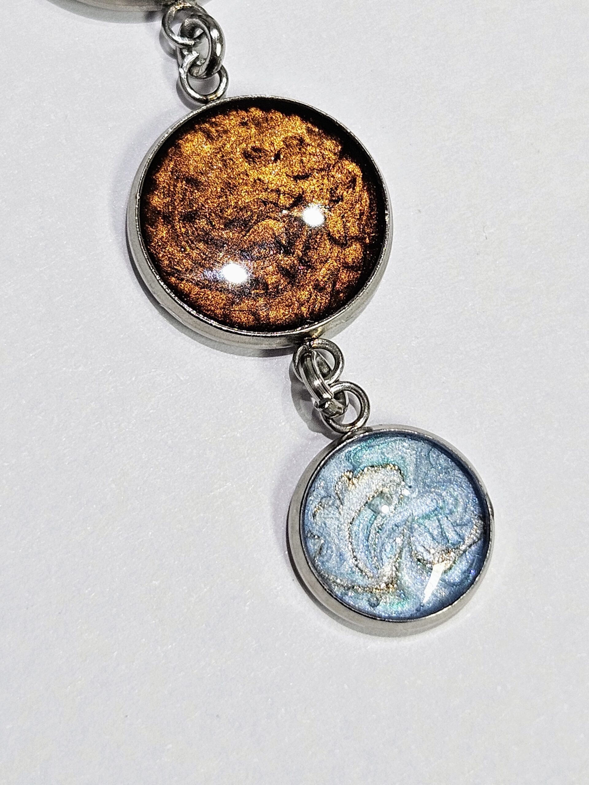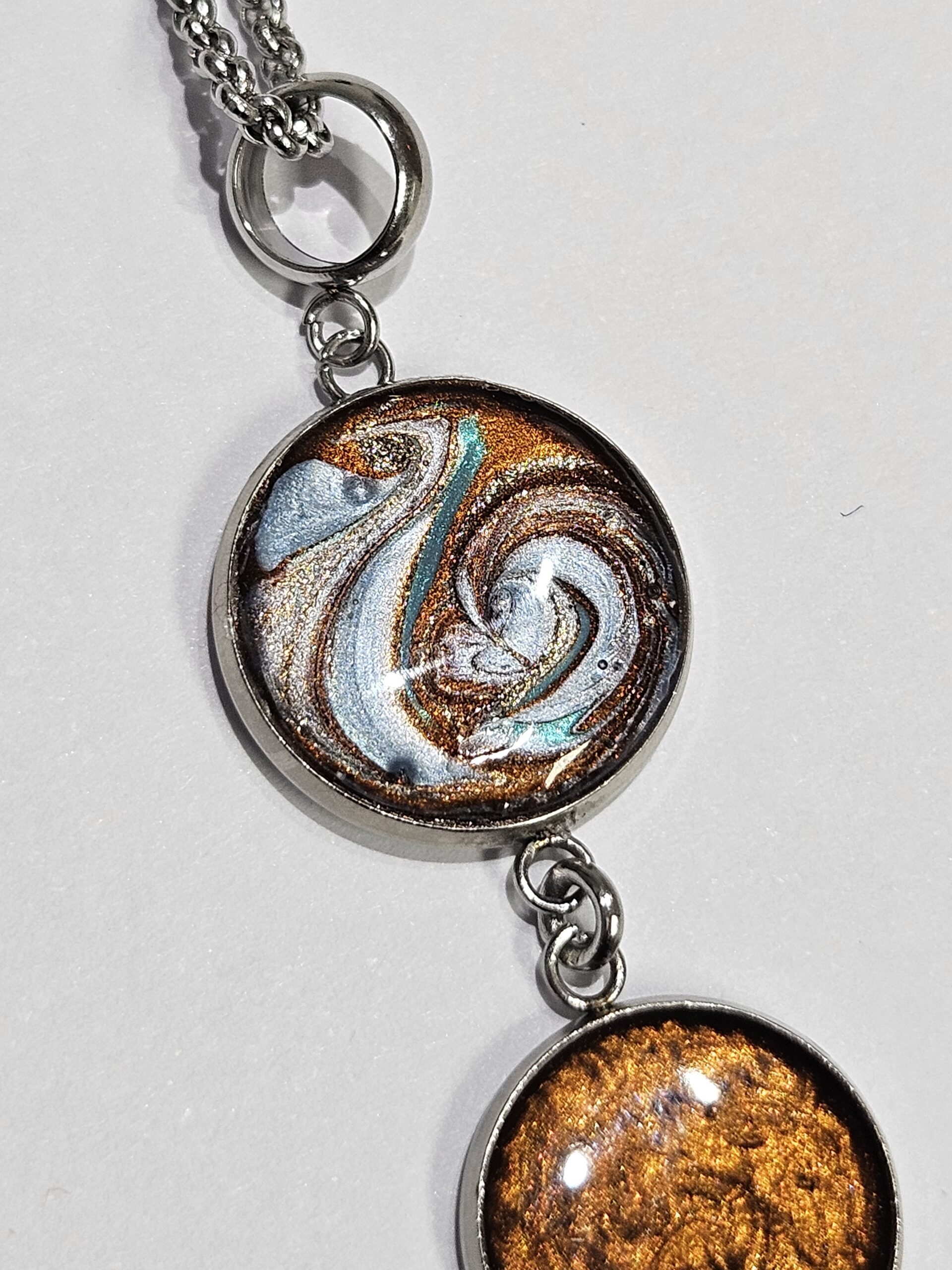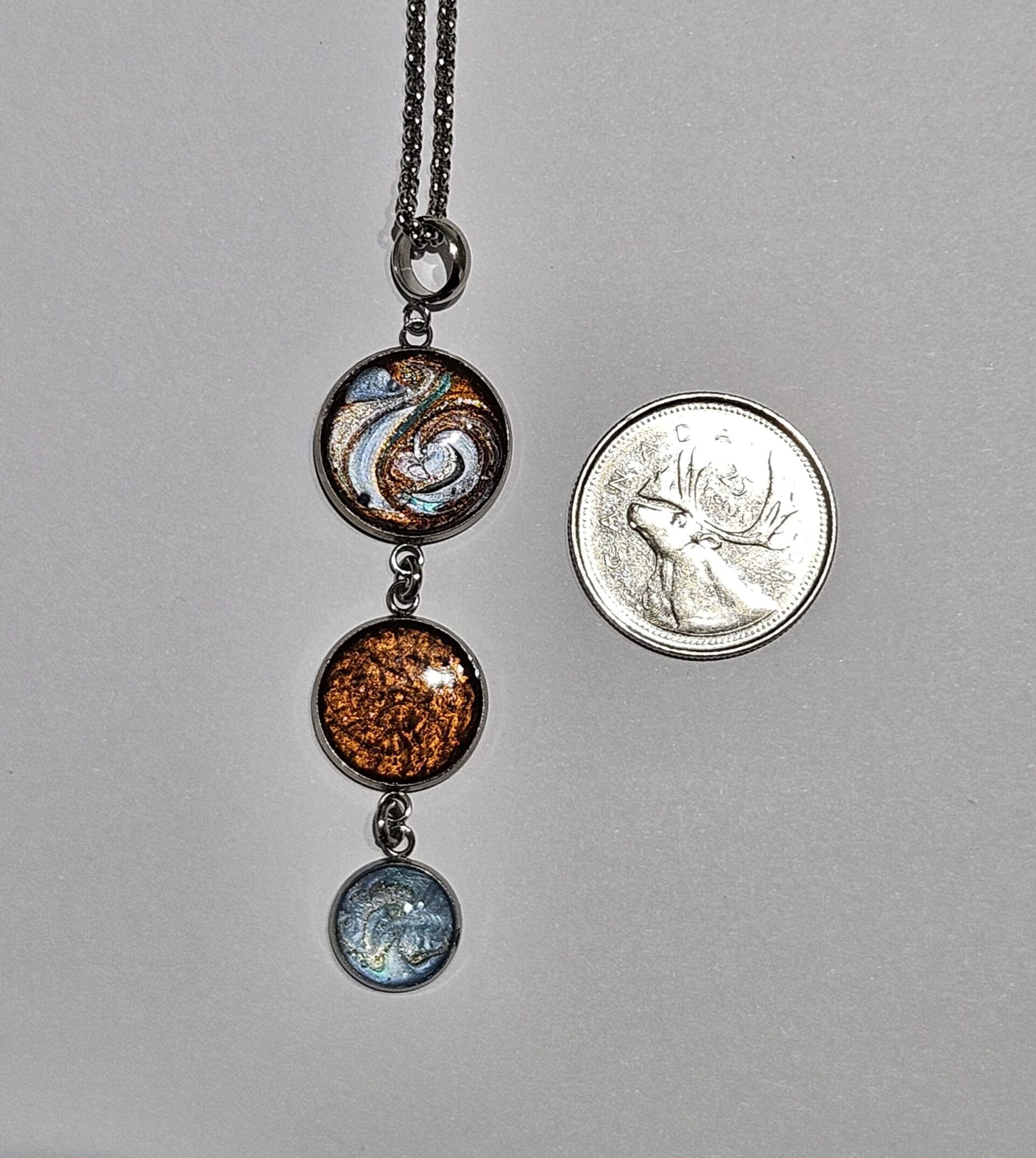 Collier en acier inoxydable hypoallergénique, avec trois médaillons de grosseurs différentes, peints à la main avec vernis à ongles et résine époxy.