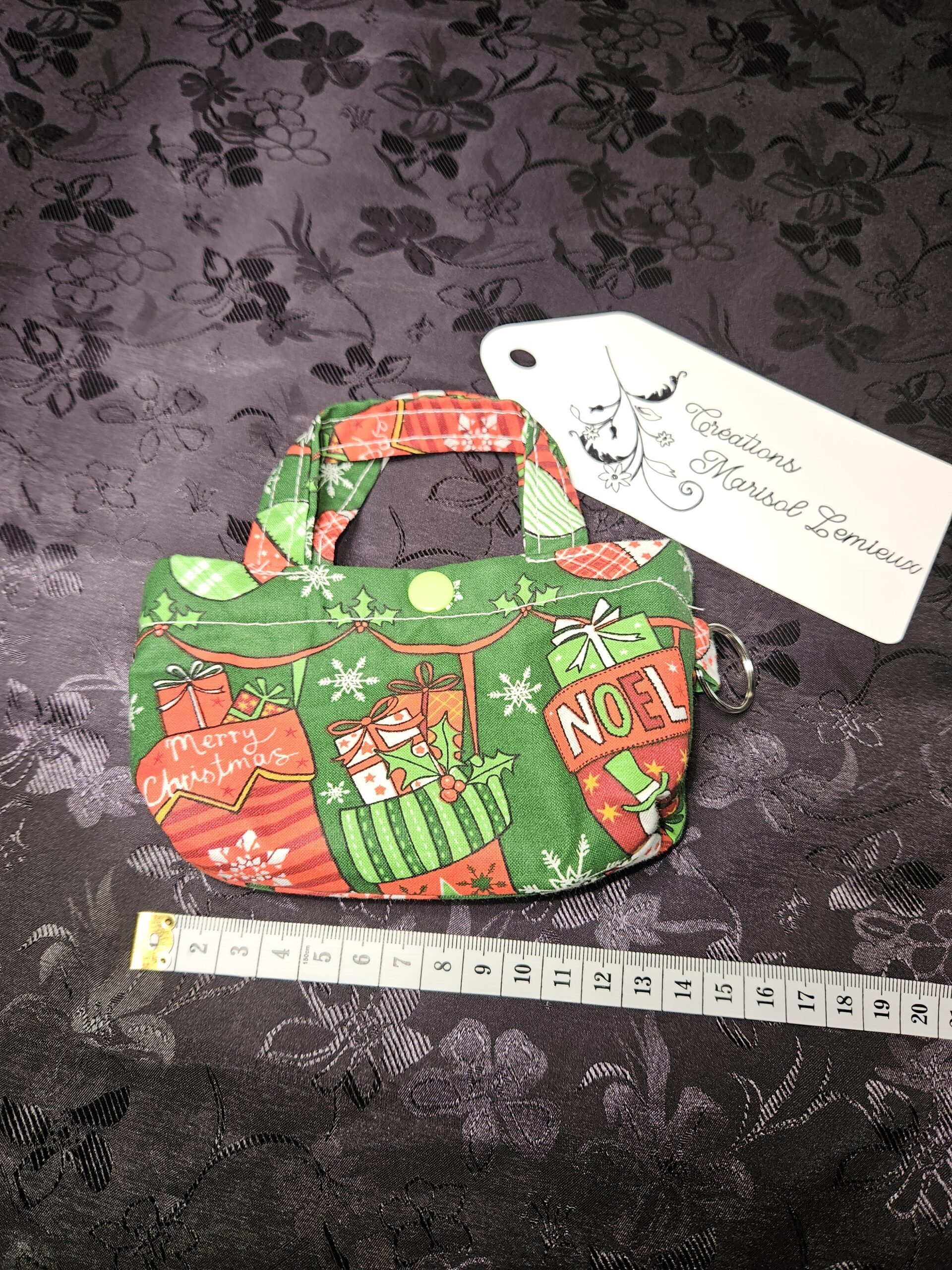 Mini sac de Noël avec bouton pressoir. Un attache de style porte clé est inclus. Peut servir pour offrir une carte cadeau dans un emballage écologique et original.