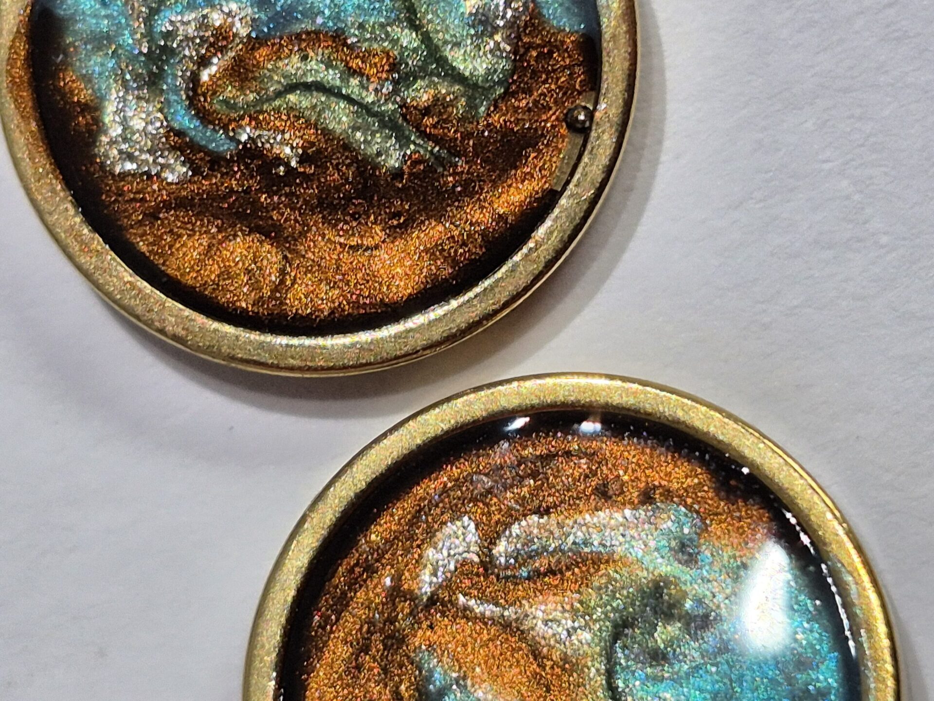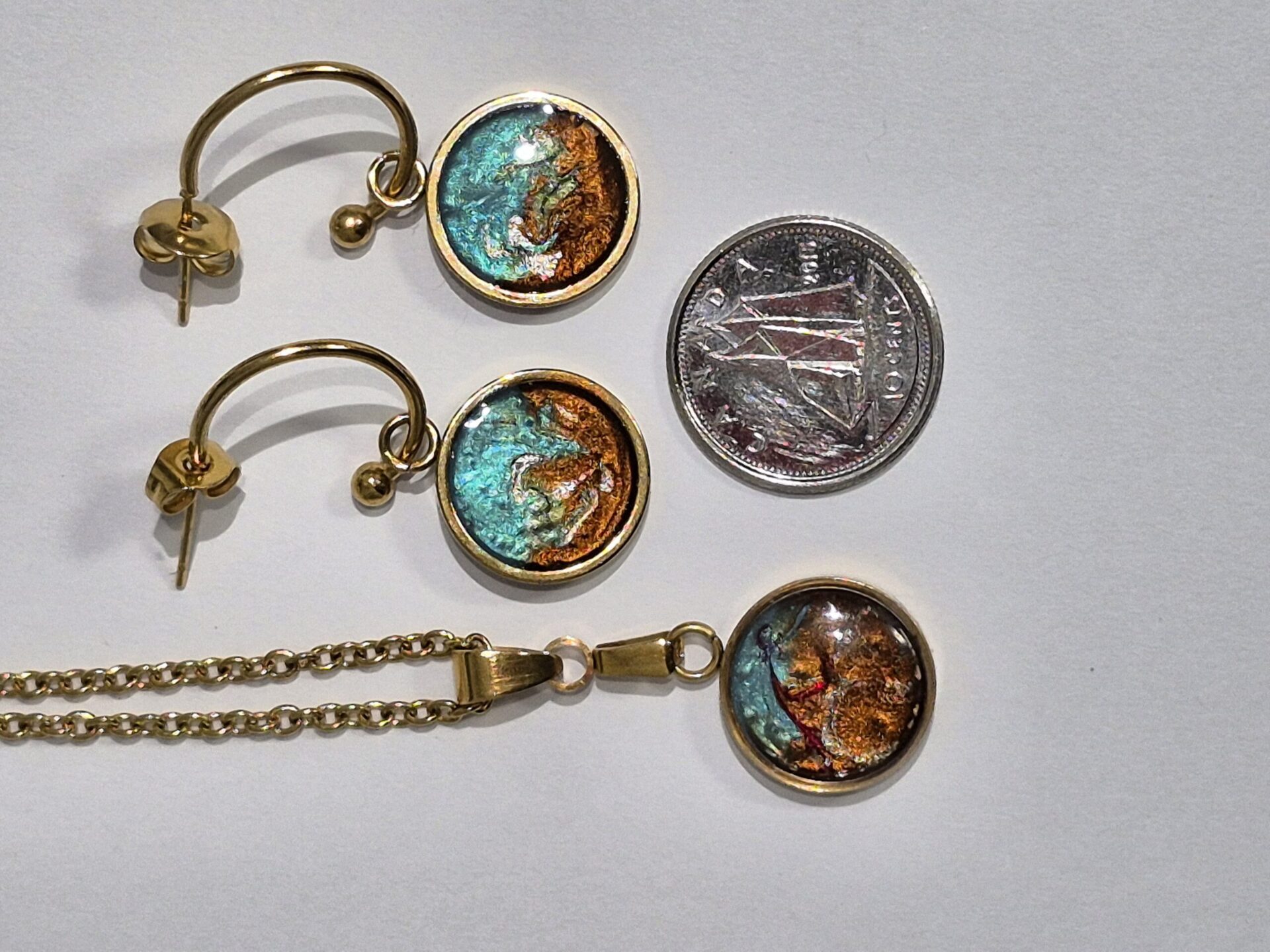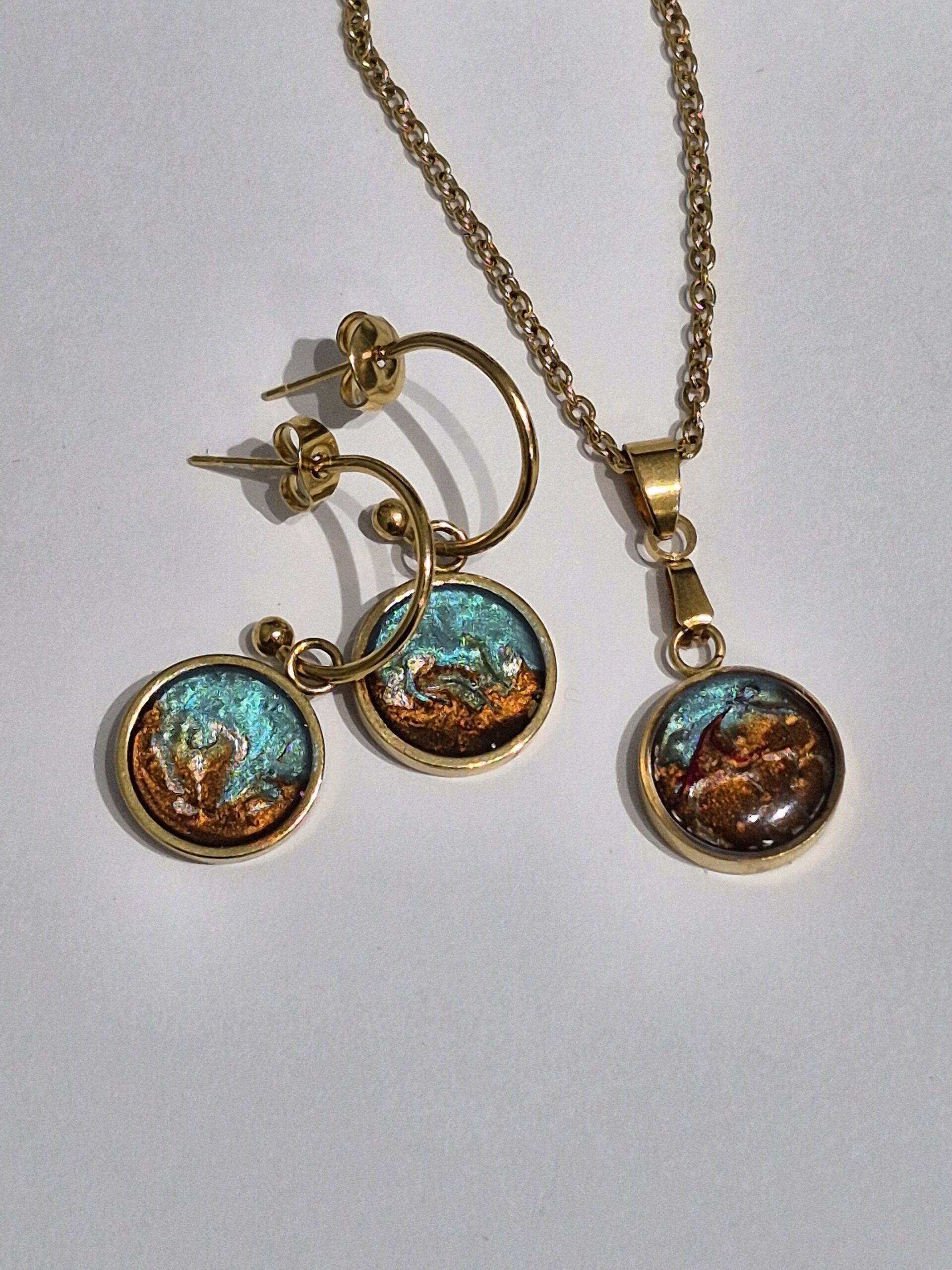Ensemble doré, collier et boucles d’oreilles en acier inoxydable hypoallergénique, peint à la main avec vernis et résine époxy..