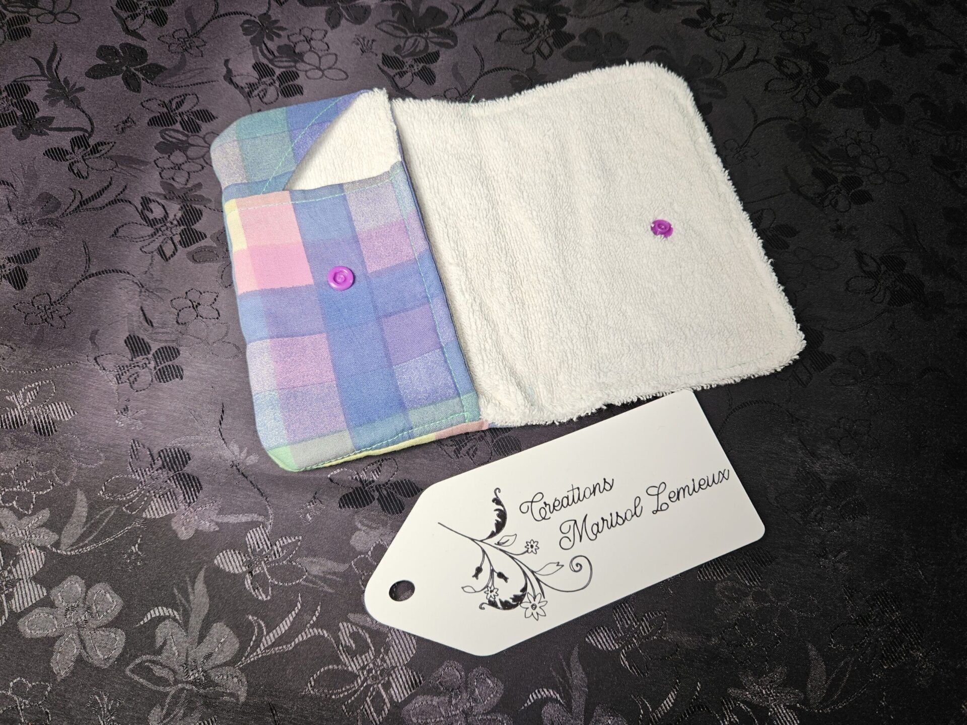 Petite trousse, fermeture avec bouton poussoir. Intérieur en ratine, extérieur en coton. Fait de tissu revalorisé.