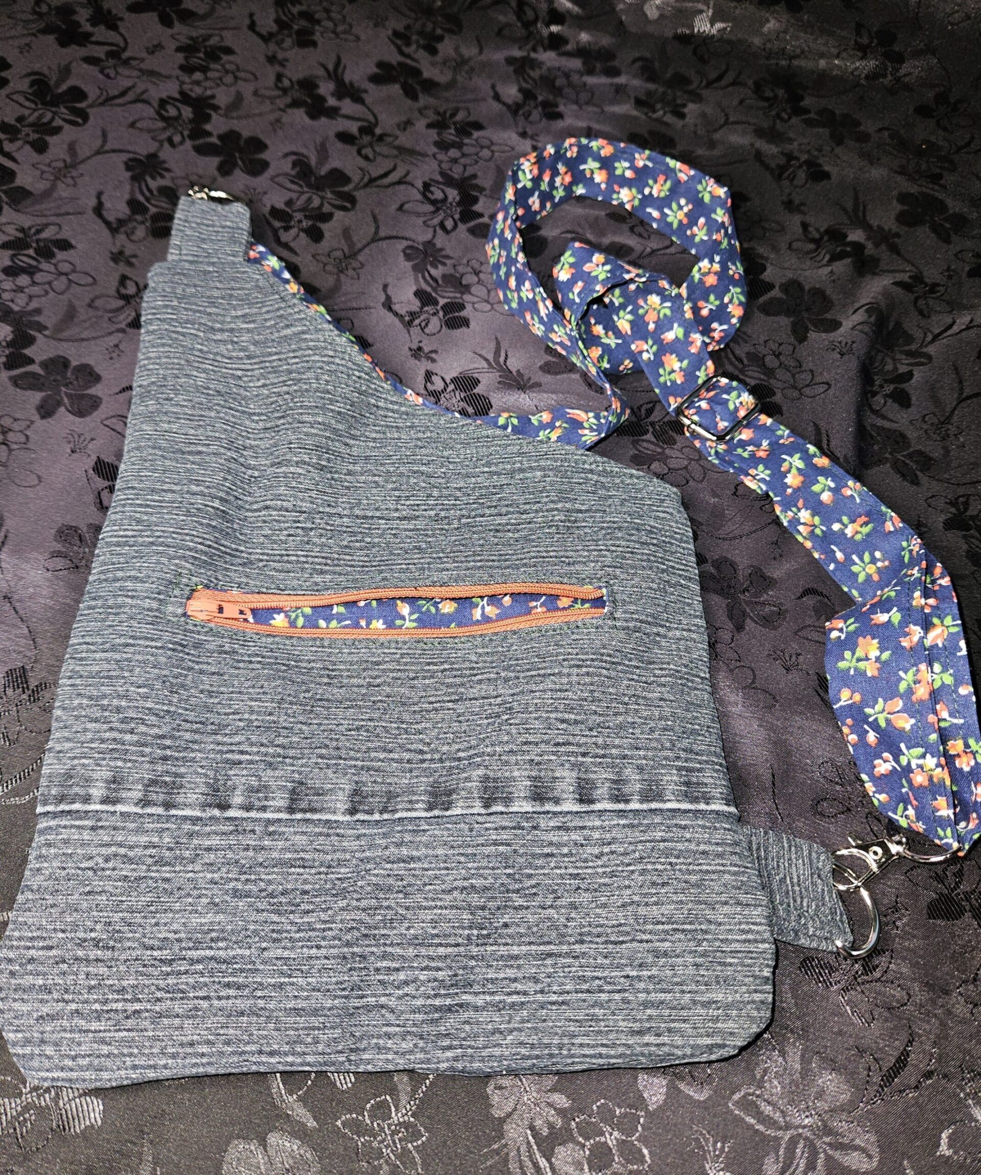 Sac bandoulière fait de matières revalorisées. La sangle est ajustable. La grande pochette se ferme via un bouton pressoir. La petite pochette se ferme avec une fermeture éclaire.
