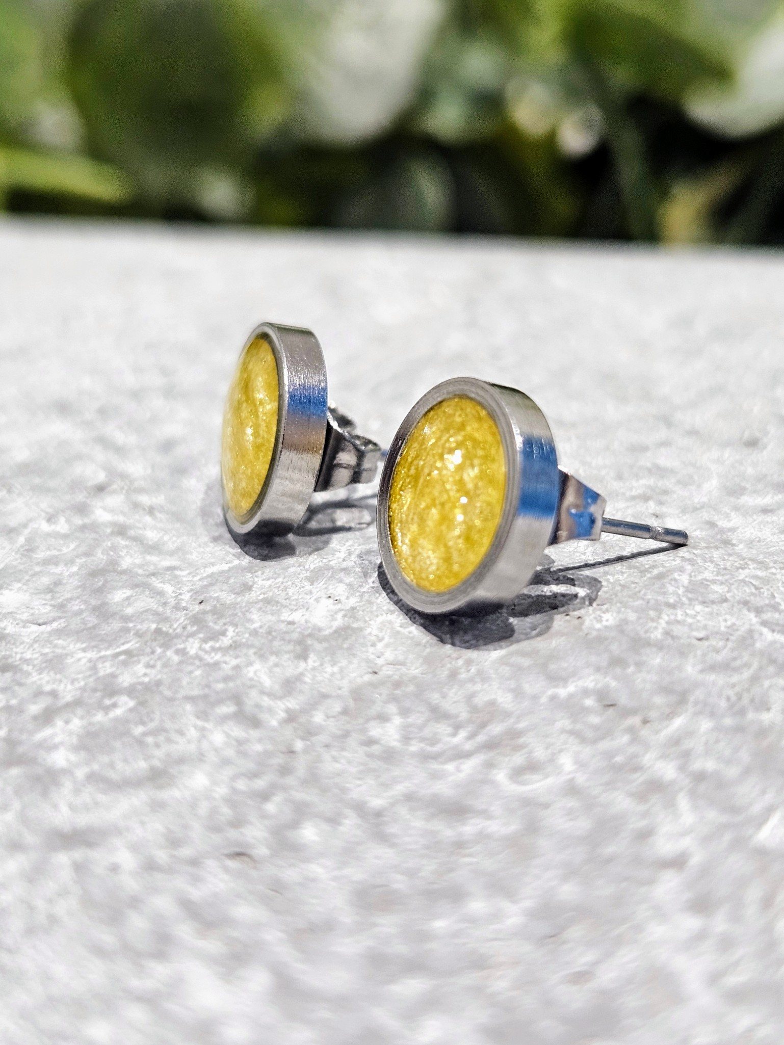 Boucles d’oreilles sur tiges, en acier inoxydable hypoalergénique, peintes à la main avec vernis et résine epoxy.